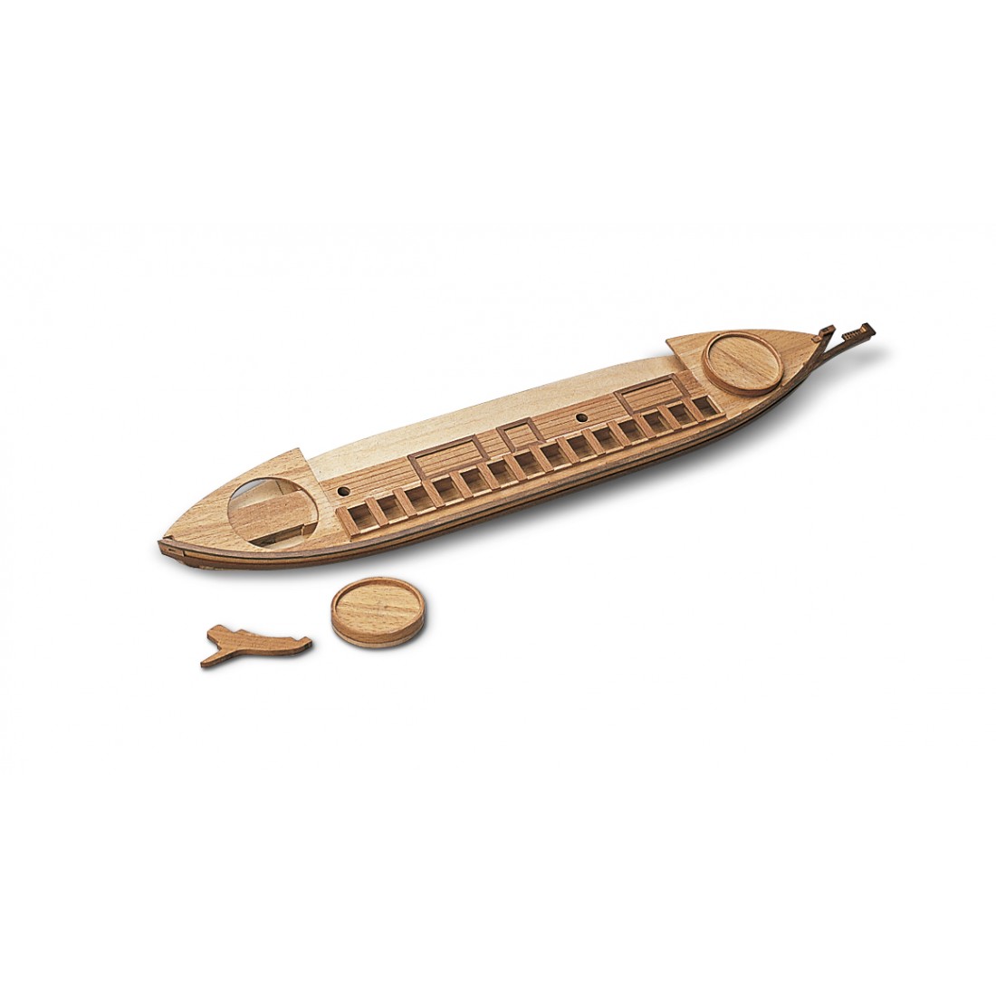 Der Bausatz enthält Kiel und Spanten aus 4mm Sperrholz, perfekt lasergeschnitten. Buchen- und Nussbaum Leisten zur Beplankung der Spant Konstruktion. Die Ausstattung mit Beschlagteilen ist perfekt. Die Kanonen aus Messing gedreht, der Stockanker aus Metall und Holz, Klampen aus Metall. Takelgarn, bedruckter Segelstoff und Wimpel werden mitgeliefert. Im Baukasten liegt Material für einen Modellständer.