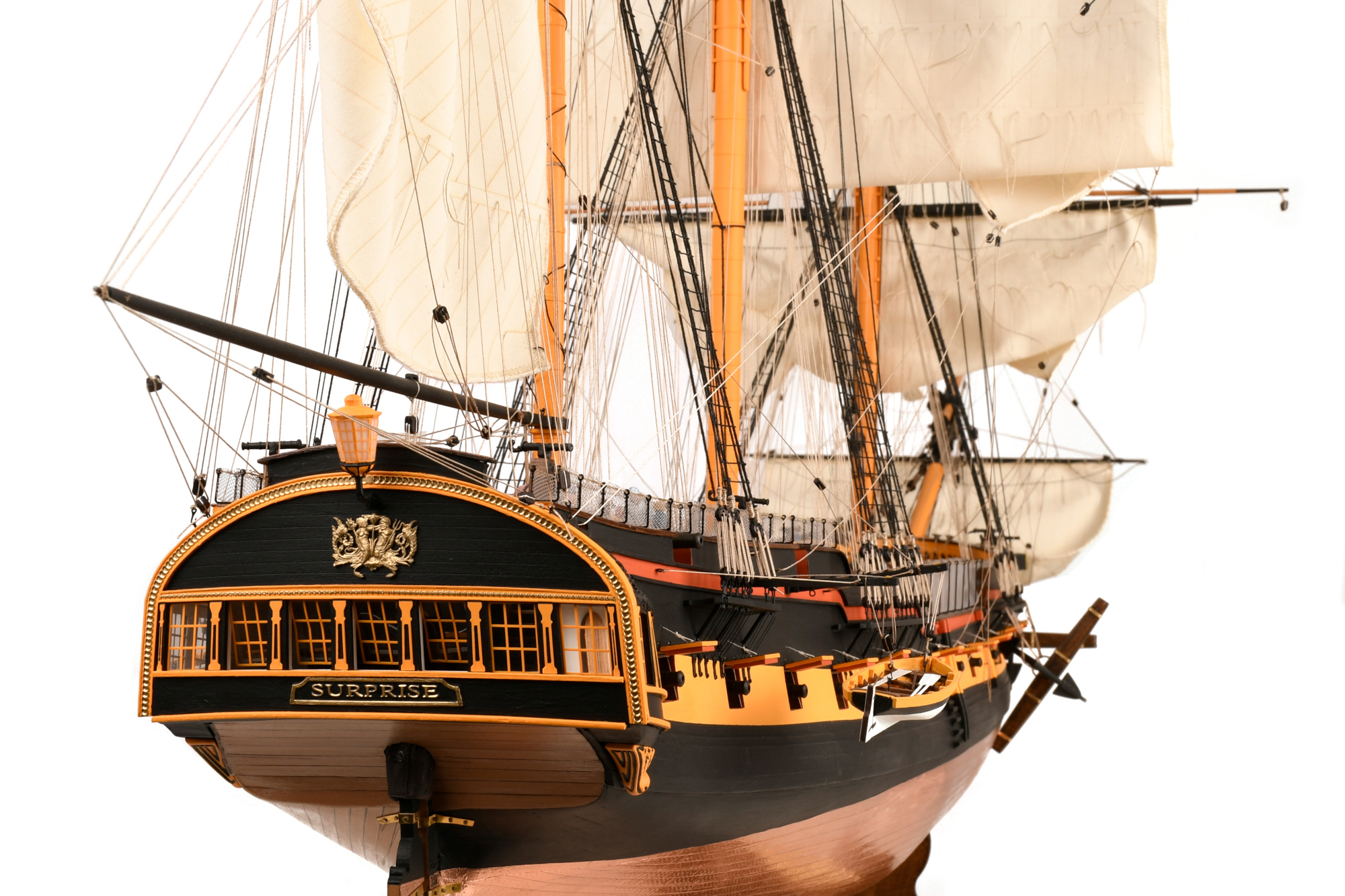 Die Surprise war eine Fregatte der 6. Klasse mit ursprünglich 28 Kanonen, später auf 32 Geschütze aufgerüstet. Sie war etwa 38 Meter lang, hatte eine Breite von rund 9,7 Metern und eine Besatzung von etwa 240 Mann. Ihre Bewaffnung bestand aus Neunpfündern auf dem Hauptdeck sowie leichteren Kanonen und Drehbassen auf den Aufbauten. Dank ihres schlanken Rumpfes und ihrer ausgewogenen Takelage galt sie als schnell, wendig und seetüchtig – ideale Eigenschaften für Aufklärungsmissionen, Geleitschutz und den Kampf gegen Piraten und Kaperfahrer.