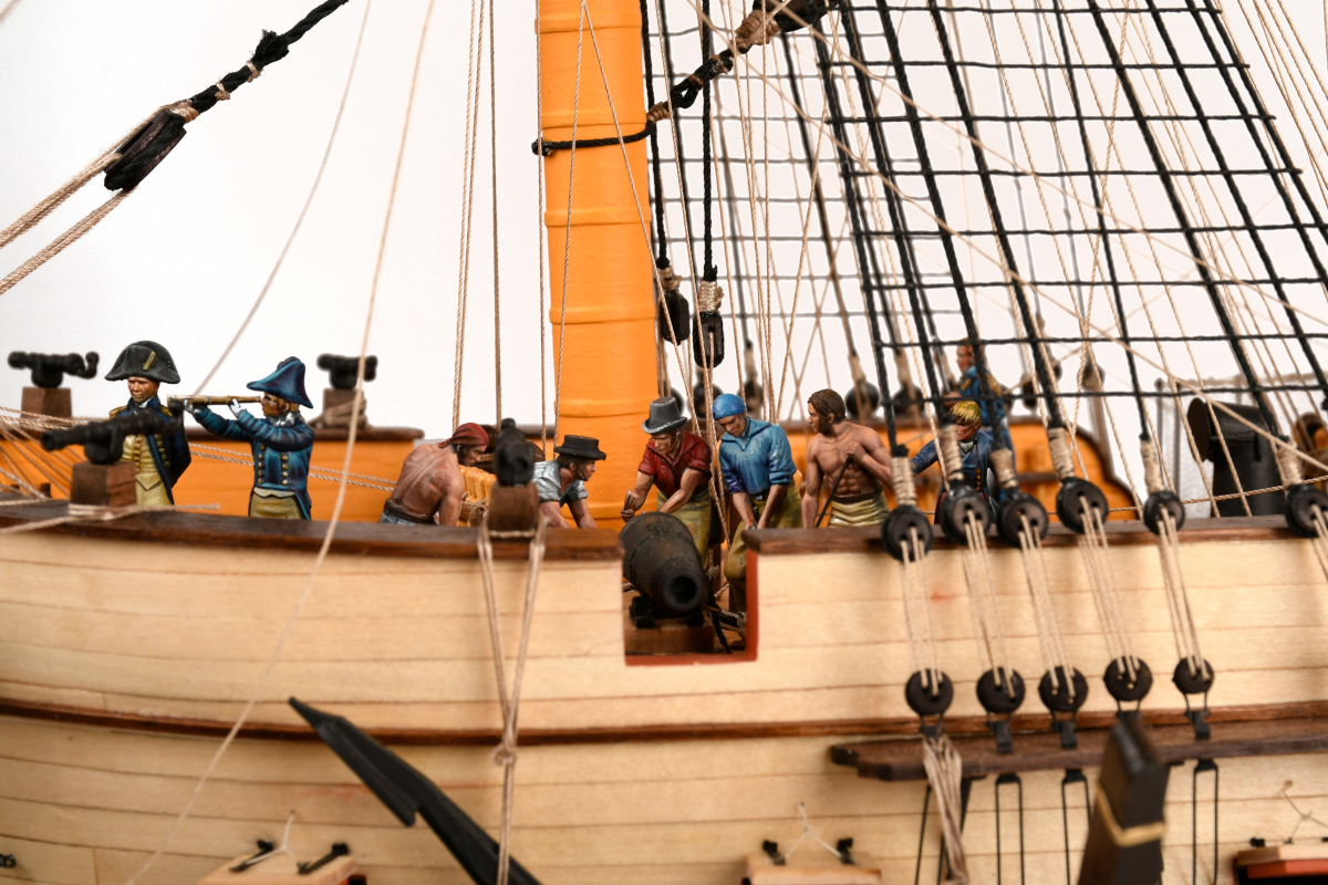 Der Bausatz enthält über 7000 einzelne Teile zum Bau des Modells. Alle Holz Teile sind präzise im Laser Cut Verfahren vorgefertigt. Der Bau erfolgt in Spantbauweise, mit einem zweiteiligem Kiel. Planken müssen natürlich selber angepasst werden. Nur hochwertigen Hölzer wie amerikanischem Nussbaum und Schweizer Birnenholz finden für die Beplankung Verwendung. Die Decks haben eine Lasergravur der Plankenstruktur. Alle Beschlagteile sind komplett aus Metall und teilweise besonders detailliert im Ätzverfahren hergestellt. Alles liegt übersichtlich in einer Sortierbox bei. Dazu gehören Nachbildungen des verzierten Hecks, der Galionsfigur, des Achterdecks mit Karronaden und des Oberdecks mit Ofen und Kanonen. Zusätzlich enthalten sind 15 Modellfiguren, darunter Aubrey und Maturin, um ikonische Szenen wie ihr Boccherini-Duett aus dem Film nachbilden zu können. Die Segel sind bereits fertig genäht. Der Rumpf kann, wie im Original mit Kupferplatten beschlagen werden. Mit einer Bauzeit von 1000-1500 Stunden muss gerechnet werden.