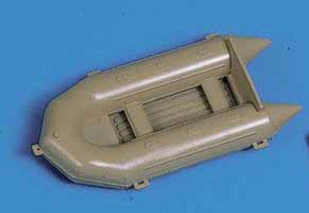 This item is a plastic inflatable dinghy kit measuring approx. 95 x 45 x 16 mm. This makes the model particularly suitable for model builders who wish to equip their project with a matching dinghy that is technically precise and visually convincing.
