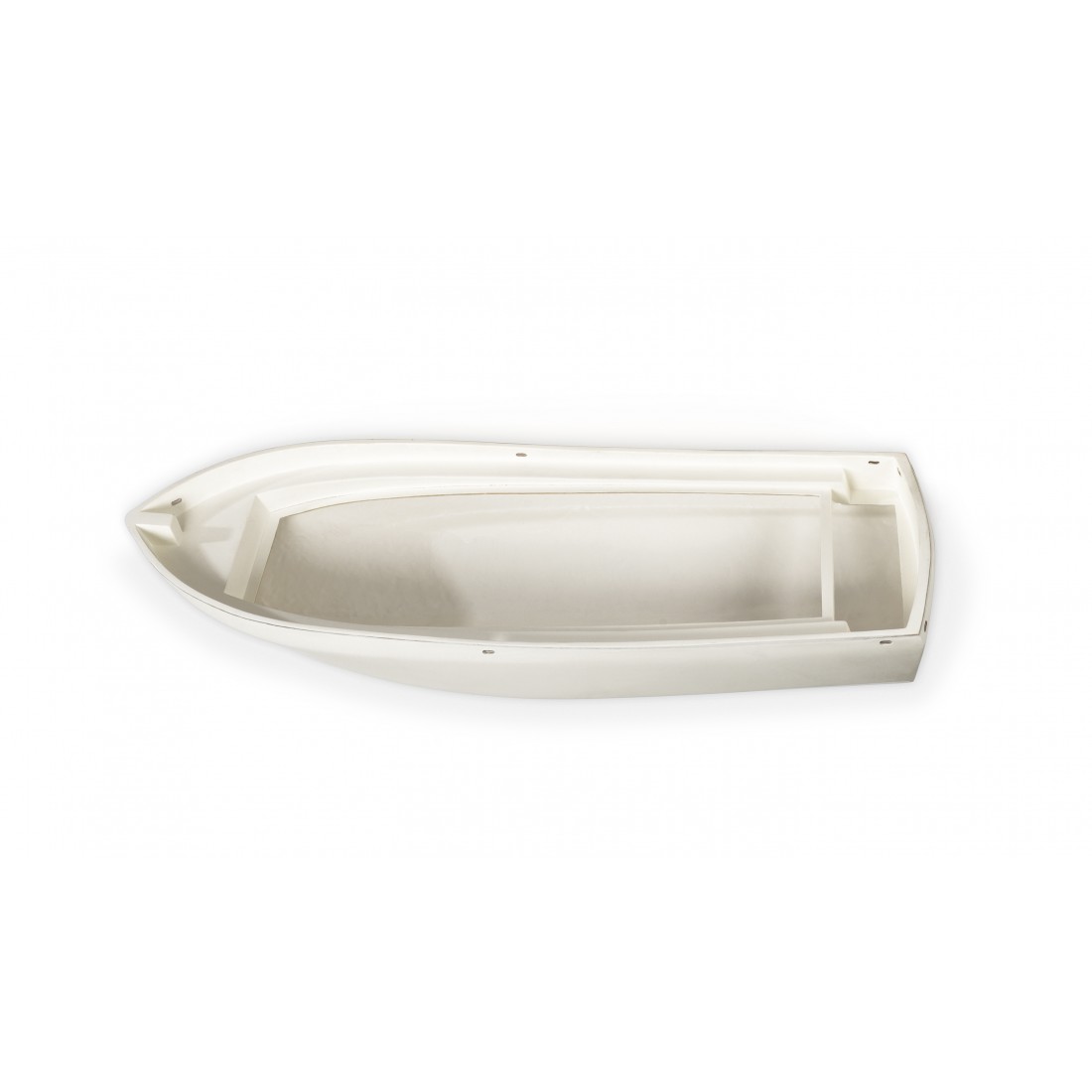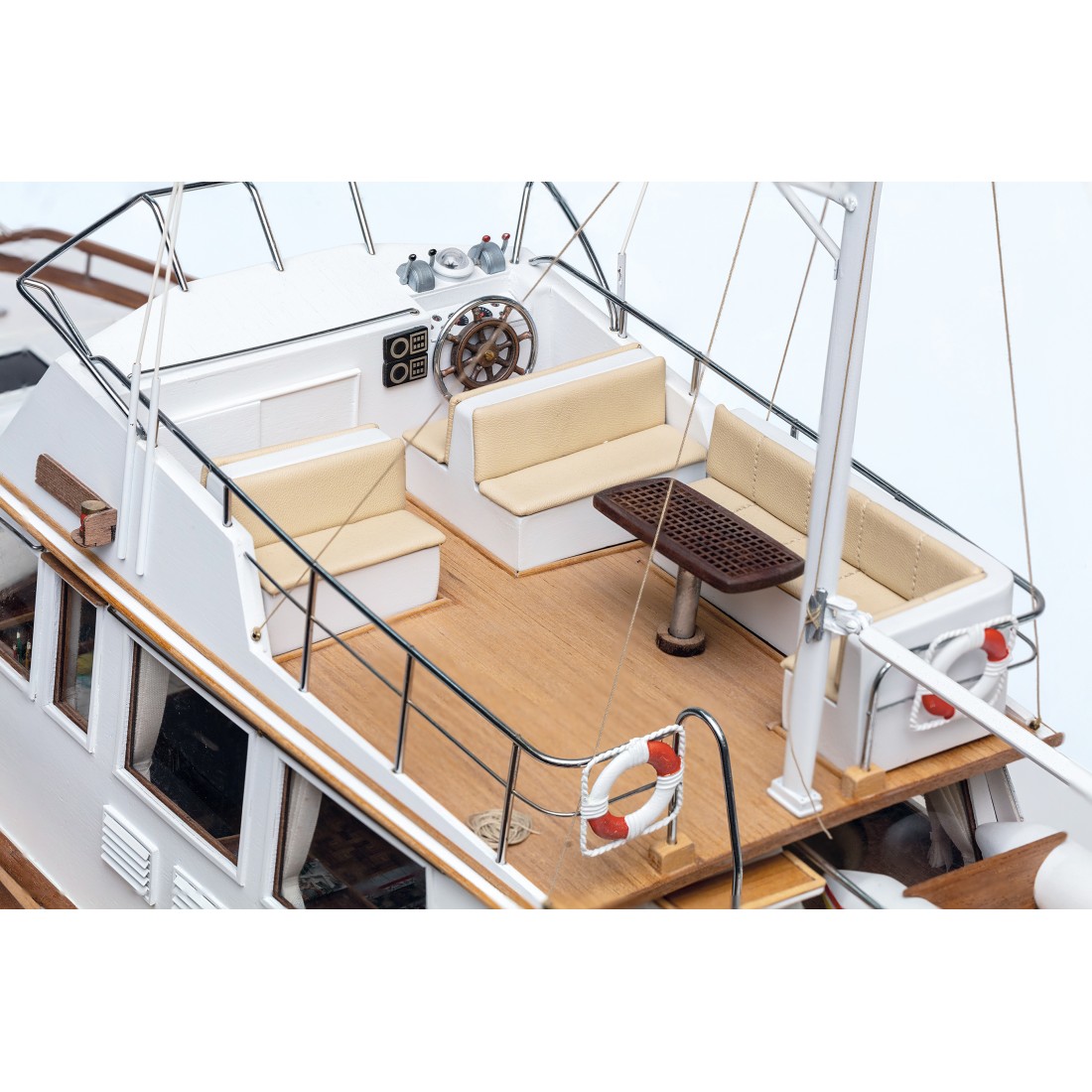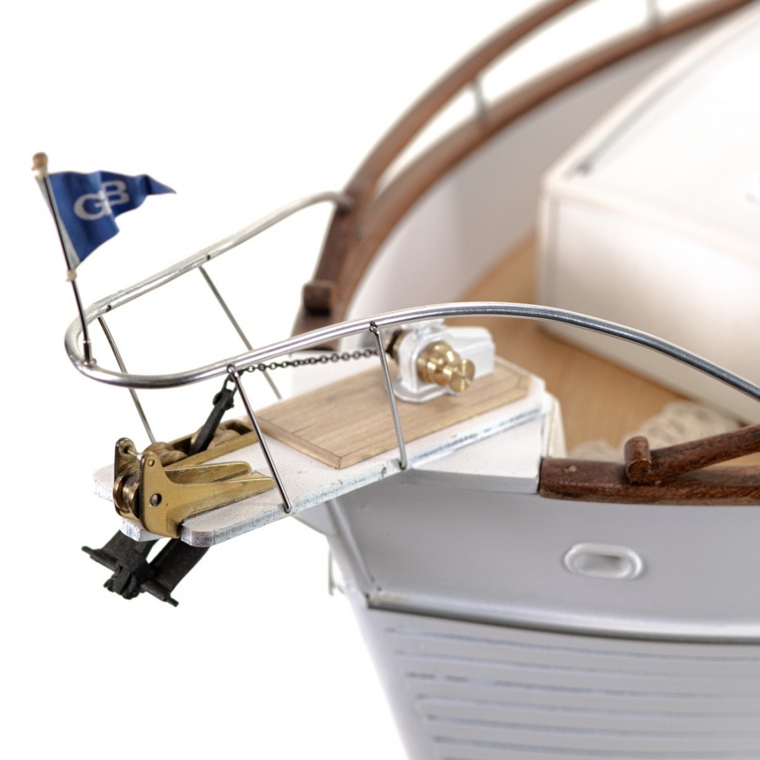 The hull is made of a perfectly manufactured super heavy plastic material. The hull already has moulded beams for the superstructure, and the scuppers are cut out. The decks and superstructure are made of plywood and are removable. Reinforcements and structural components are made of MDF. All necessary fittings are included, mostly made of metal, some etched and some made of brass. The complex railing is pre-fabricated and chrome-plated. The entire interior can be recreated. The benches are included in the kit, ready-made and perfectly crafted. The set includes printed décor for the interior with instruments for the cockpit and carpet. The rudder and shaft system are made of cast metal and are not functional.