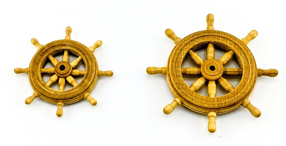 Das Ruderrad besteht aus Holz und überzeugt durch eine schöne, feine Detaillierung. Die präzise Ausarbeitung der Speichen und die saubere Verarbeitung machen es zu einem echten Blickfang auf jeder Schiffsbrücke.